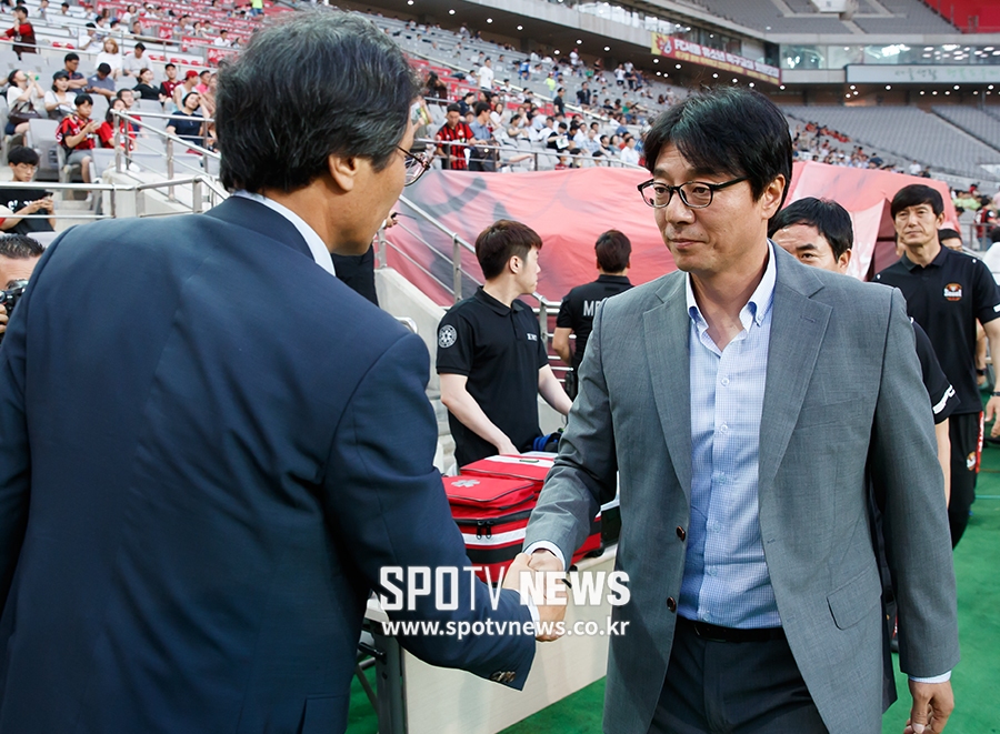 [스포티비뉴스=서울월드컵경기장, 한희재 기자] FC서울과 포항 스틸러스의 2017 K리그 클래식 경기가 12일 오후 서울 마포구 성산동 서울월드컵경기장에서 열렸다. 포항 최순호 감독과 FC서울 황선홍 감독이 악수를 나누고 있다.