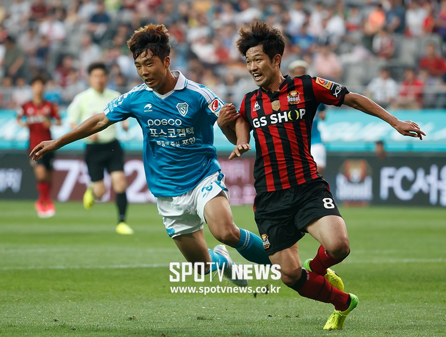 [스포티비뉴스=서울월드컵경기장, 한희재 기자] FC서울과 포항 스틸러스의 2017 K리그 클래식 경기가 12일 오후 서울 마포구 성산동 서울월드컵경기장에서 열렸다. 포항 이찬양과 FC서울 이상호가 몸싸움을벌이고 있다.