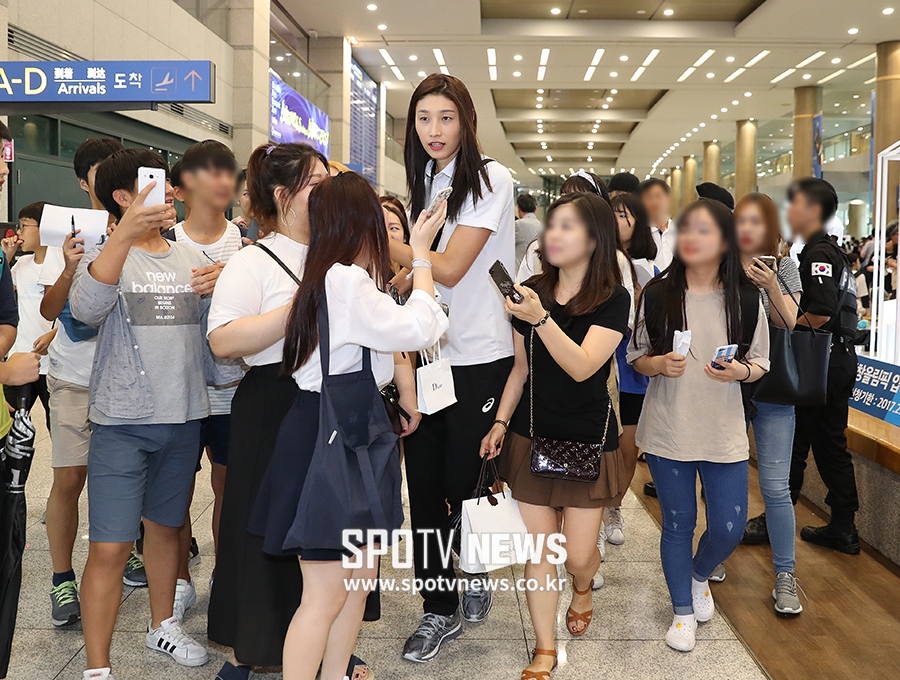 [스포티비뉴스=인천국제공항, 곽혜미 기자] 국제배구연맹(FIVB) 2017 그랑프리 세계여자배구대회 폴란드 원정을 마친 여자 배구 대표팀이 18일 오전 인천국제공항을 통해 귀국했다. 김연경이 팬들에게 둘러싸여 있다.