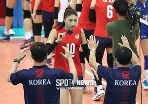 [스포티비뉴스=수원, 곽혜미 기자] 2017 수원 그랑프리 세계여자배구대회 한국과 카자흐스탄의 경기가 21일 오후 수원실내체육관에서 열렸다. 셧아웃으로 승리한 한국 김연경이 감독과 하이파이브를 하고 있다.