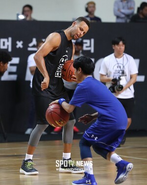[스포티비뉴스=장충체, 곽혜미 기자] NBA 슈퍼 스타 스테픈 커리의 첫 내한을 기념한 대규모 스포츠 행사 가 서울 중구 장충체육관에서 열렸다. 스테픈 커리가 학생을 지도하고 있다.