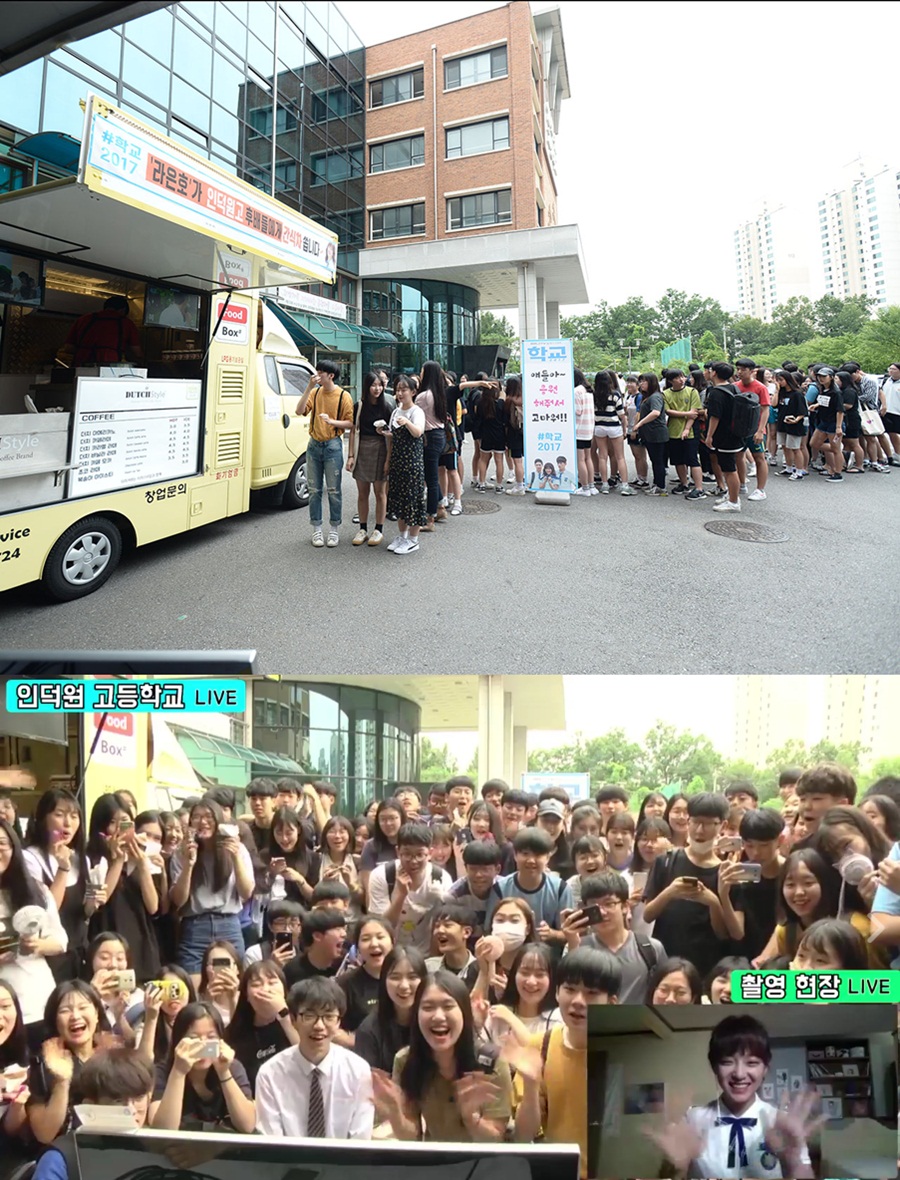 이날 현장에서는 촬영장 이원 생중계로 선배 김세정과 통화가 진행됐다. 촬영 중 짬을 내 후배들과 만난 김세정은 “후배들이 많이 응원해주셔서 이렇게 좋은 기회가 생겼다. 고맙다”고 인사를 건넸다. 학생들은 “사랑해요 세정 선배님!” “누나 너무 예뻐요!”라며 환영했다.