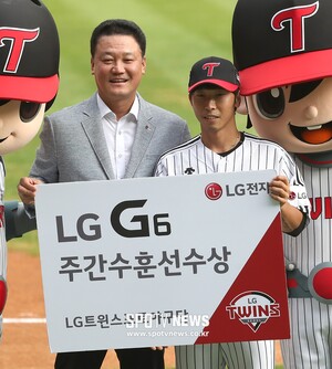[스포티비뉴스=잠실, 곽혜미 기자] 1일 오후 서울 잠실야구장에서 열린 2017 KBO 리그 LG 트윈스와 롯데 자이언츠의 경기, 경기 전 황목치승이 주간 수훈선수상을 수상하고 있다.