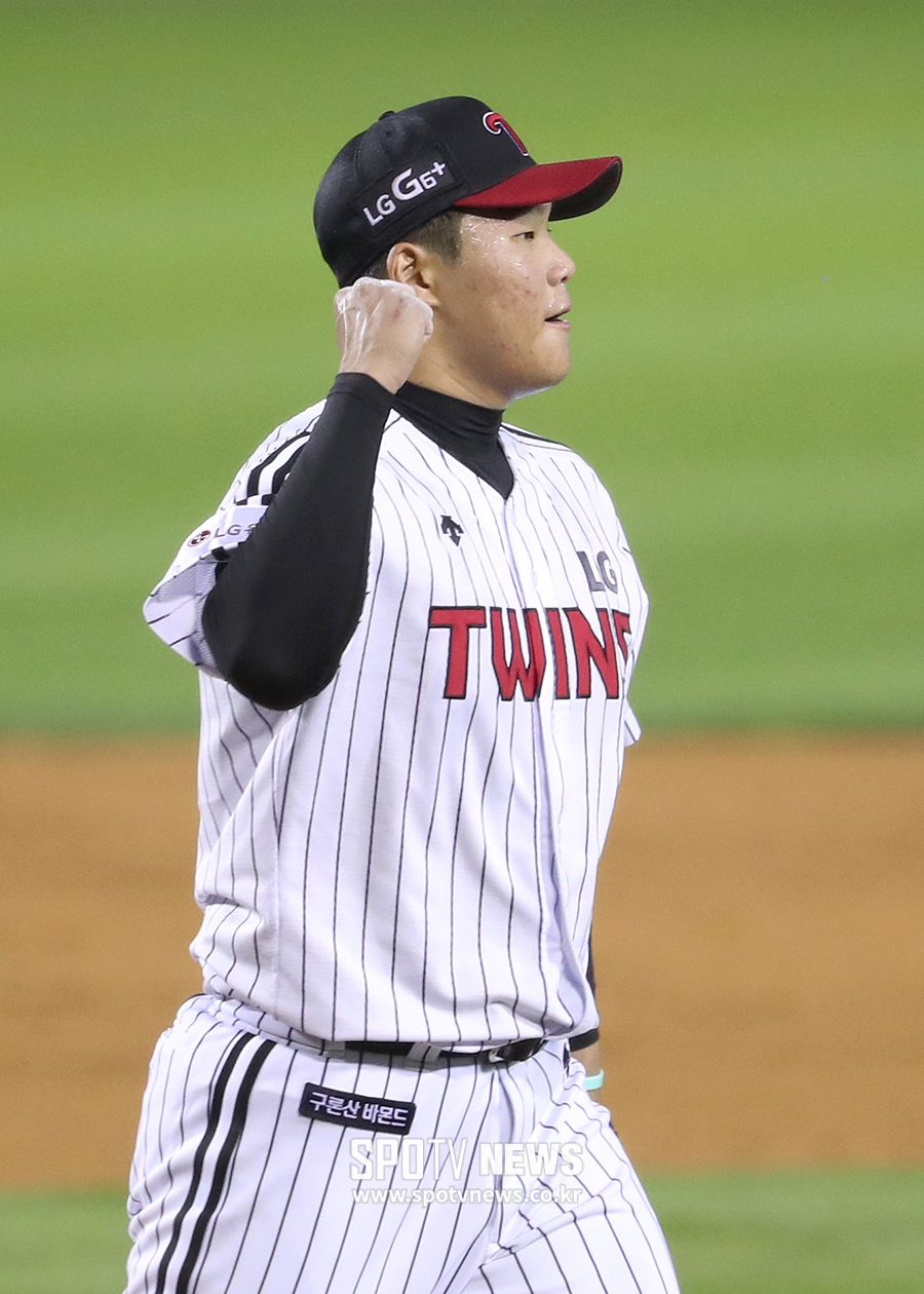 [스포티비뉴스=잠실, 곽혜미 기자] 1일 오후 서울 잠실야구장에서 열린 2017 KBO 리그 LG 트윈스와 롯데 자이언츠의 경기. 4회초 1사 1루 상황에서 병살로 이닝을 마무리 한 LG 선발 김대현이 주먹을 불끈 쥐고 있다.