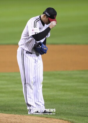 [스포티비뉴스=잠실, 곽혜미 기자] 1일 오후 서울 잠실야구장에서 열린 2017 KBO 리그 LG 트윈스와 롯데 자이언츠의 경기. 7회초 LG 선발 김대현이 선두타자 전준우에게 사과의 인사를 하고 있다.