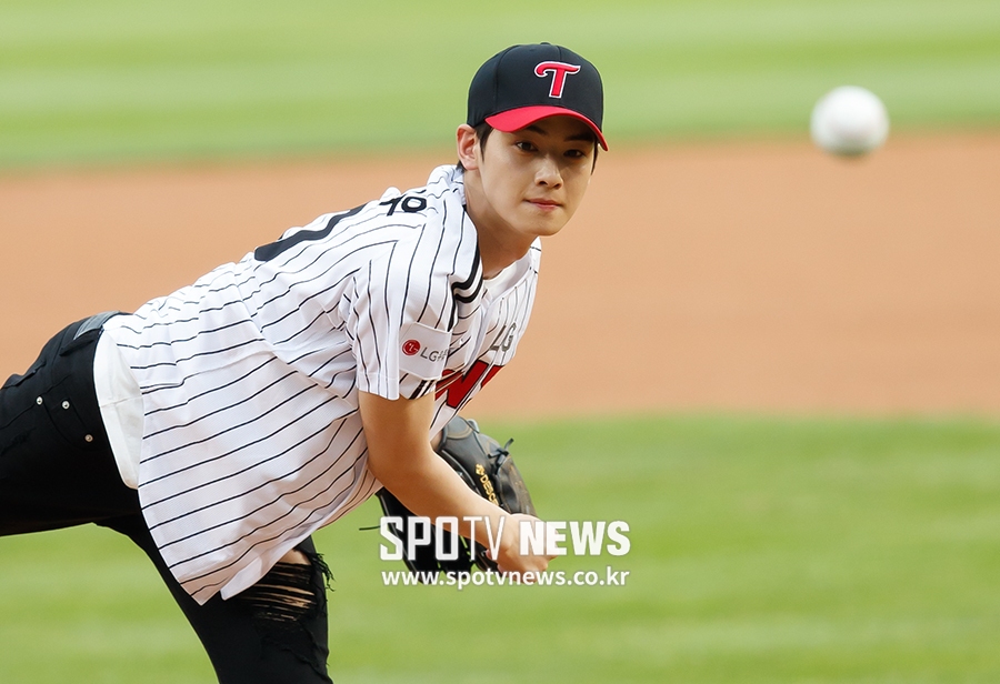 [스포티비뉴스=잠실, 한희재 기자] LG 트윈스와 롯데 자이언츠의 2017 KBO 리그 경기가 2일 오후 서울 잠실야구장에서 열렸다. 시구에 나선 보이그룹 아스트로의 차은우가 공을 던지고 있다.