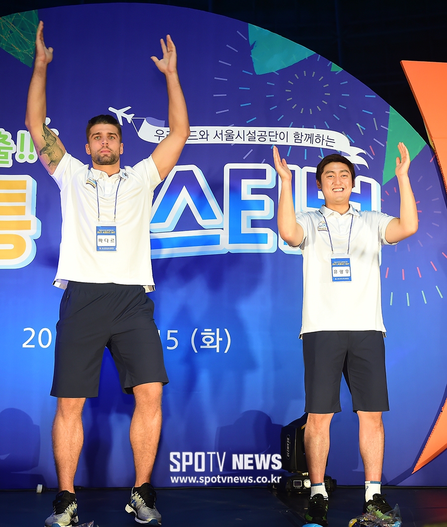 [스포티비뉴스] 우리카드와 서울시설관리공단이 함께하는 더위 탈출 통통 페스티벌이 15일 오후 서울 중구 장충체육관에서 열렸다. 우리카드 파다르와 유광우가 응원 안무를 선보이고 있다.