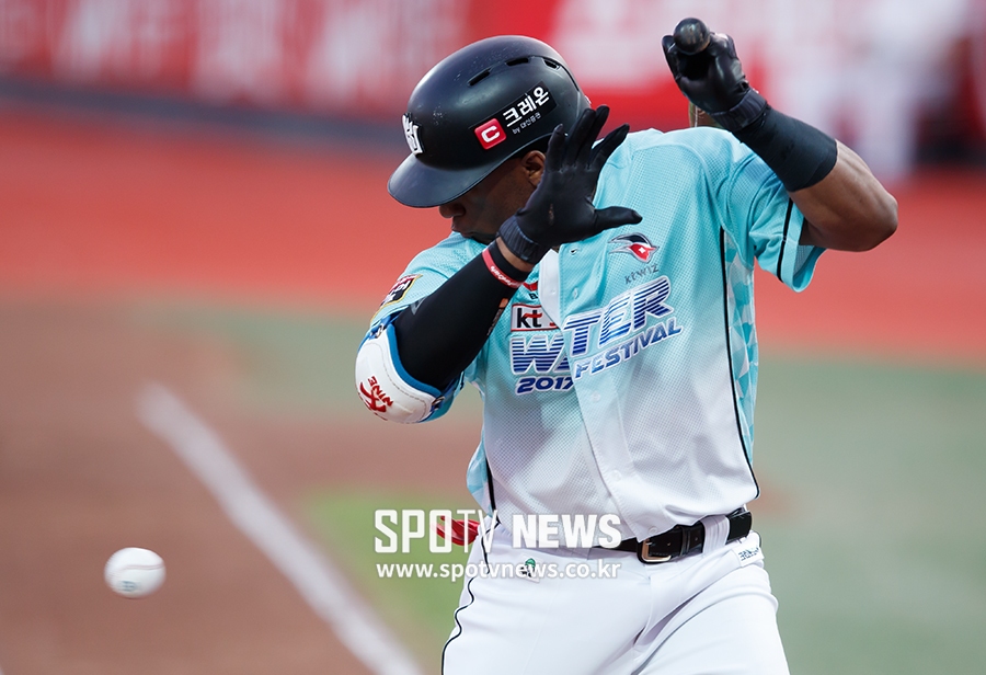 [스포티비뉴스=수원, 한희재 기자] kt 위즈와 삼성 라이온즈의 2017 KBO 리그가 18일 오후 수원kt위즈파크에서 열렸다. 1회말 2사, kt 로하스가 몸쪽 볼을 피하고 있다.