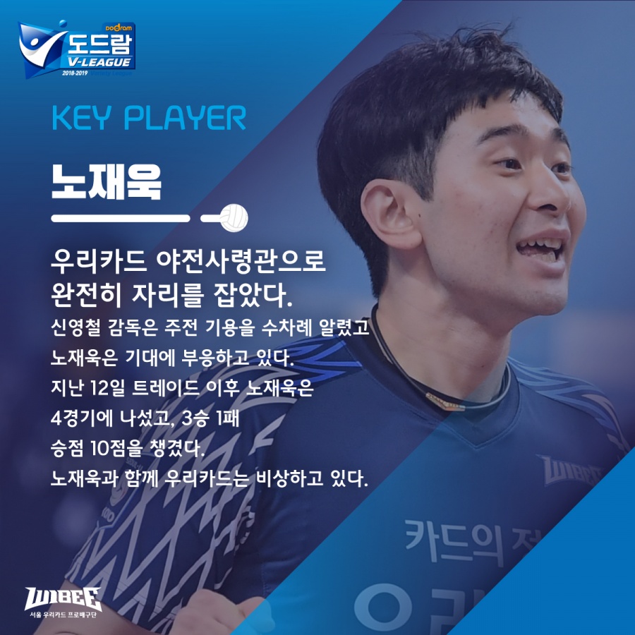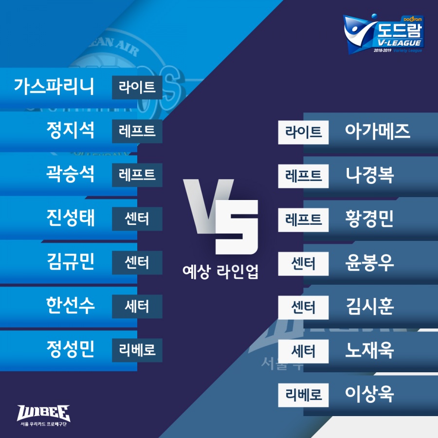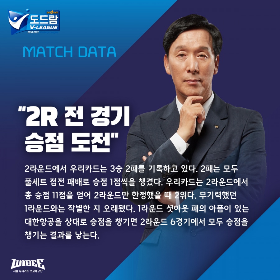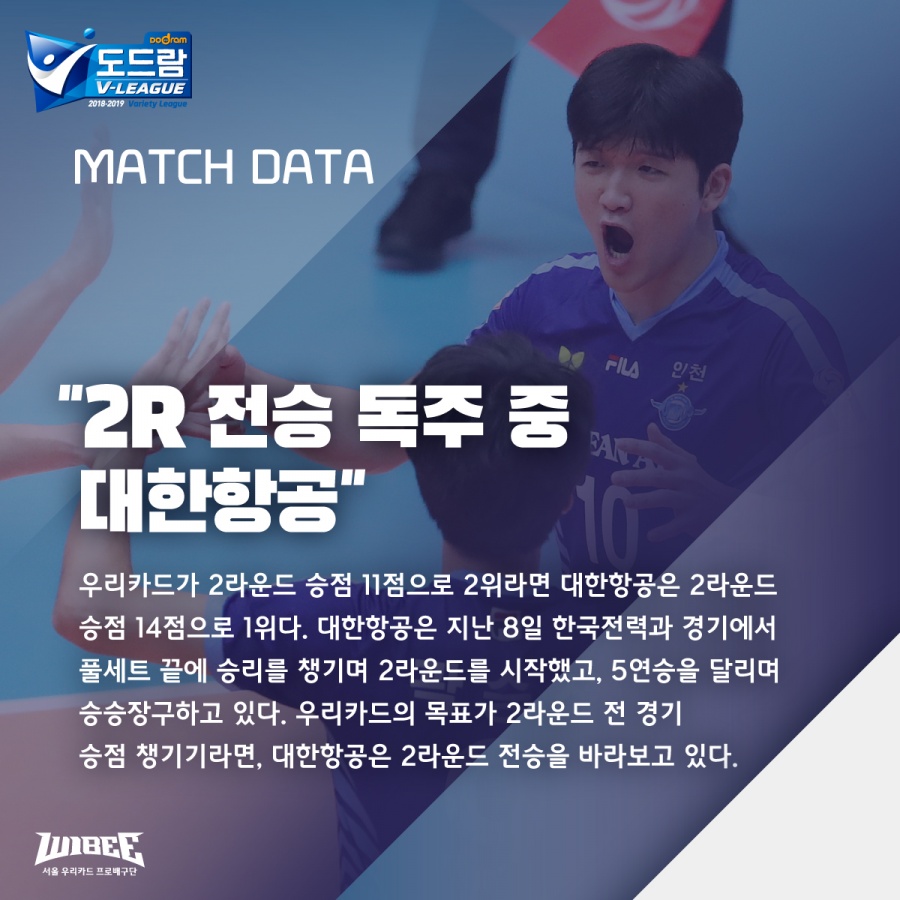[스포티비뉴스=박성윤 기자 / 그래픽 디자이너 김종래] 우리카드가 29일 인천 계양체육관에서 열릴 도드람 2018-2019 V리그 남자부 2라운드 대한항공과 맞대결을 벌인다. 두 팀 모두 2라운드 마지막 경기다. 우리카드는 5승 6패 승점 17점으로 5위, 대한항공은 9승 2패 승점 27점으로 1위다. 우리카드가 이날 경기를 잡으면 4위로 2라운드를 마칠 수 있다.