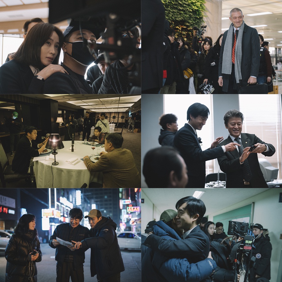 김혜수는 영화 속 냉철한 모습과는 다른 친근한 분위기로 현장을 이끌었음을 보여준다. 김혜수와 날카로운 대립으로 눈길을 끈 IMF 총재 역의 뱅상 카셀은 카메라를 향해 환한 미소를 짓는 여유로운 모습이다.