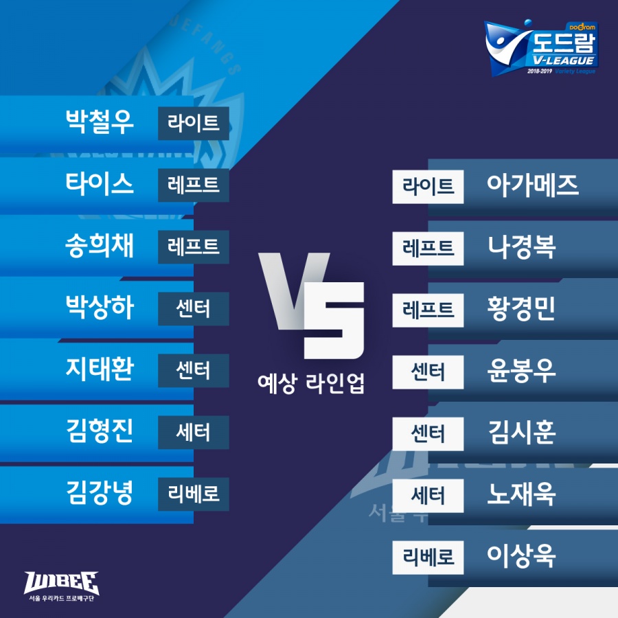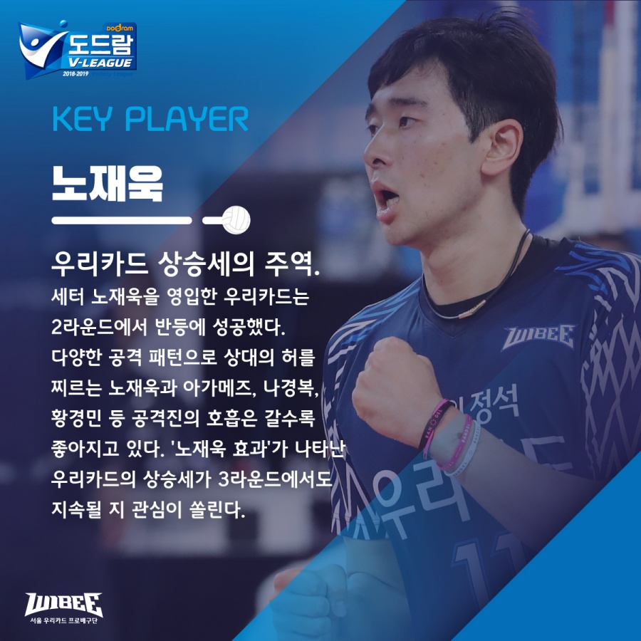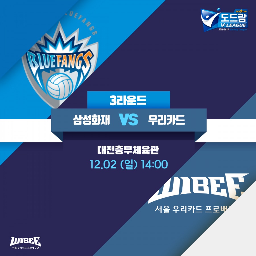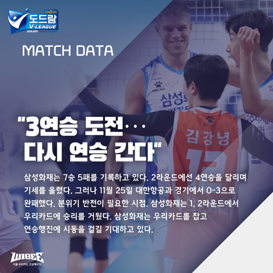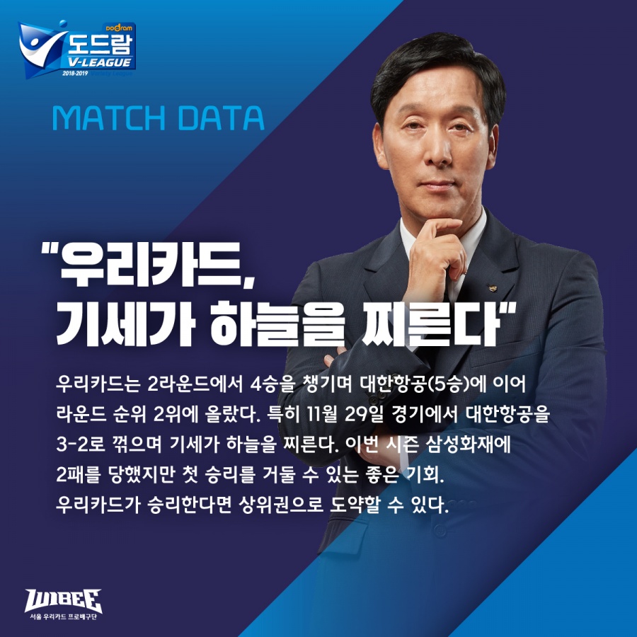 [스포티비뉴스=정형근 기자 / 그래픽 디자이너 김종래] 우리카드가 2일 대전충무체육관에서 도드람 2018-19시즌 프로배구 V리그 남자부 3라운드 삼성화재와 맞대결을 펼친다. 우리카드는 6승 6패 승점 19점으로 4위, 삼성화재는 7승 5패 승점 17점으로 5위다. 우리카드가 이날 경기를 잡으면 상위권 팀들을 추격할 수 있다. 삼성화재는 지난 1, 2라운드에서 우리카드에 승리를 거뒀다. 그러나 우리카드의 최근 기세가 만만치 않다. 우리카드는 11월 29일 대한항공과 경기에서 3-2 대역전승을 챙겼다. 자신감을 충전한 우리카드가 삼성화재전 첫 승리를 기록할지 주목된다.