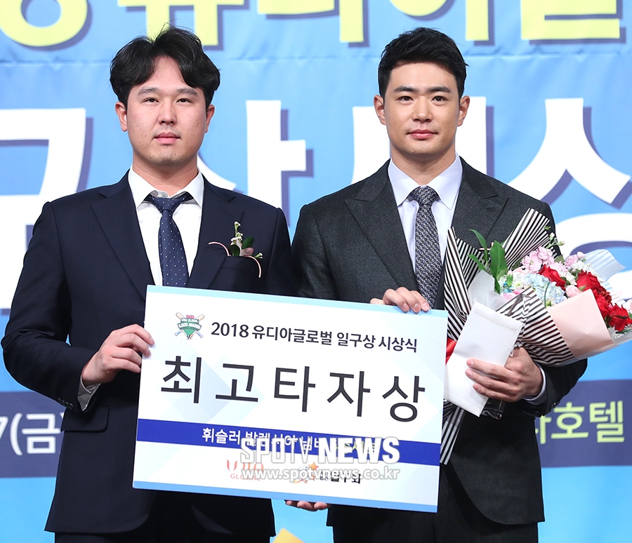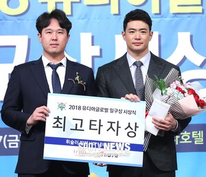 김재환(두산)과 정우람(한화)은 7일 서울시 강남구 청담동 리베라호텔 베르사이유홀에서 열린 2018 유디아글로벌 일구상시상식에서 올해의 타자상, 올해의 투수상을 각각 수상했다. 김재환은 44홈런으로 홈런왕, 정우람은 35세이부로 세이브왕을 차지했다.