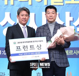 [스포티비뉴스=서울, 곽혜미 기자] 2018 유디아 글로벌 일구상 시상식이 7일 오후 서울 강남구 청담동 리베라호텔에서 열렸다. 프런트상을 받은 SK 단장이 조계현 단장과 기념 촬영을 하고 있다.