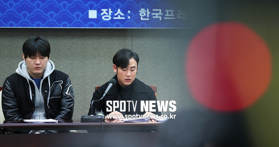 [스포티비뉴스=서울, 곽혜미 기자] 문우람 관련 이태양 양심 선언 및 문우람 국민 호소문 발표 기자회견이 10일 오전 서울 중구 프레스센터에서 열렸다. 이태양과 문우람이 기자회견을 갖고 있다.