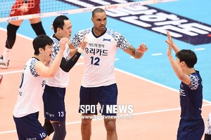 [스포티비뉴스] 한국전력과 우리카드의 2018-2019 V리그 남자부 경기가 14일 오후 경기도 수원실내체육관에서 열렸다. 득점을 올린 우리카드 선수들이 하이파이브를 하고 있다. (우리카드 제공)
