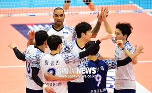 [스포티비뉴스] 한국전력과 우리카드의 2018-2019 V리그 남자부 경기가 14일 오후 경기도 수원실내체육관에서 열렸다. 득점을 올린 우리카드 아가메즈가 동료들과 하이파이브를 하고 있다. (우리카드 제공)