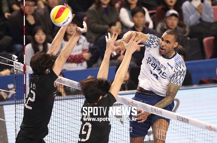 [스포티비뉴스=천안, 한희재 기자] 현대캐피탈과 우리카드의 2018-2019 도드람 V리그 남자부 경기가 17일 오후 충남 천안 유관순체육관에서 열렸다. 우리카드 아가메즈가 공격하고 있다.