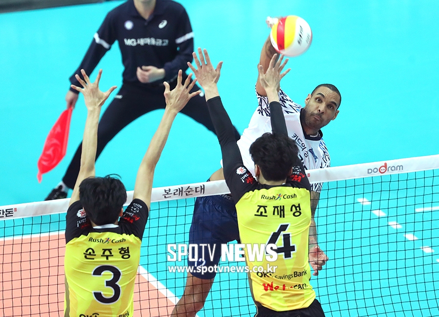 [스포티비뉴스=안산, 곽혜미 기자] 2018-2019 도드람 V리그 남자부 OK저축은행과 우리카드의 경기가 20일 오후 안산 상록수체육관에서 열렸다. 우리카드 아가메즈가 공격을 시도하고 있다.