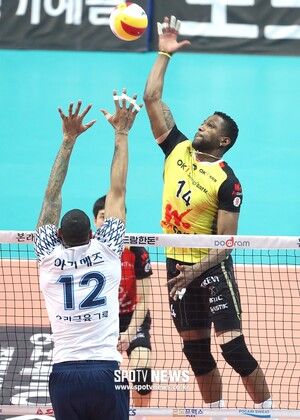 [스포티비뉴스=안산, 곽혜미 기자] 2018-2019 도드람 V리그 남자부 OK저축은행과 우리카드의 경기가 20일 오후 안산 상록수체육관에서 열렸다. OK저축은행 요스바니가 공격을 시도하고 있다.