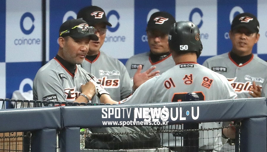 [스포티비뉴스=고척돔, 곽혜미 기자] '2018 신한은행 마이카 KBO 리그' 넥센 히어로즈와 한화 이글스의 경기가 14일 오후 서울 구로구 고척스카이돔에서 열렸다. 7회초 1사 1루 상황 한화 이성열이 투런포를 날리고 한용덕 감독의 가슴을 치고 있다.