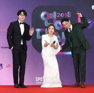 [스포티비뉴스=서울, 곽혜미 기자] 2018 KBS 연예대상 레드카펫 행사가 22일 오후 서울 영등포구 여의도 KBS 본관 시청자광장에서 열렸다. 성시경, 김숙, 이휘재가 포즈를 취하고 있다.
