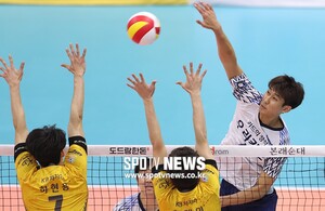 [스포티비뉴스=의정부, 한희재 기자] KB손해보험과 우리카드의 2018-2019 도드람 V리그 남자부 경기가 23일 오후 경기도 의정부체육관에서 열렸다. 우리카드 한성정이 공격하고 있다.