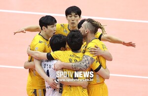 [스포티비뉴스=의정부, 한희재 기자] KB손해보험과 우리카드의 2018-2019 도드람 V리그 남자부 경기가 23일 오후 경기도 의정부체육관에서 열렸다. 득점을 올린 KB손해보험 선수들이 기뻐하고 있다.