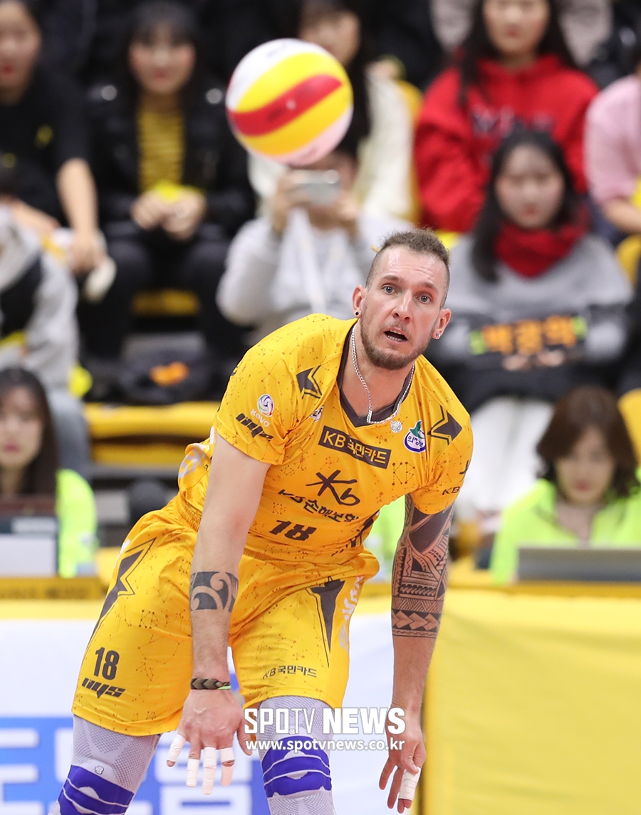 [스포티비뉴스=의정부, 한희재 기자] KB손해보험과 우리카드의 2018-2019 도드람 V리그 남자부 경기가 23일 오후 경기도 의정부체육관에서 열렸다. KB손해보험 펠리페가 서브를 하고 있다.