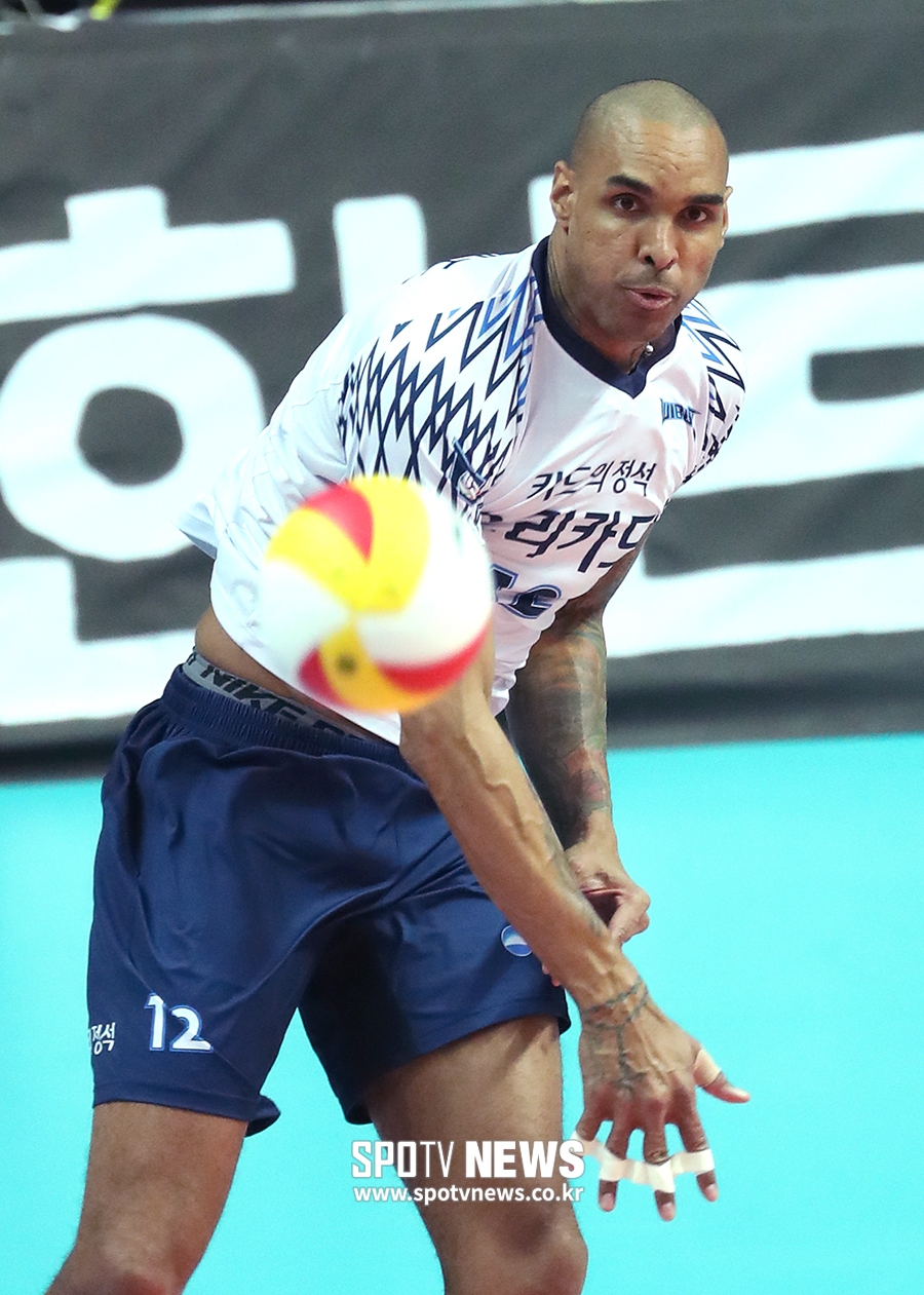 [스포티비뉴스=안산, 곽혜미 기자] 2018-2019 도드람 V리그 남자부 OK저축은행과 우리카드의 경기가 28일 오후 안산 상록수체육관에서 열렸다. 우리카드 아가메즈가 서브를 넣고 있다.