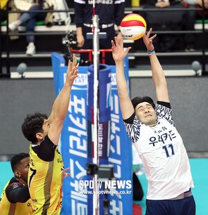 [스포티비뉴스=안산, 곽혜미 기자] 2018-2019 도드람 V리그 남자부 OK저축은행과 우리카드의 경기가 28일 오후 안산 상록수체육관에서 열렸다. 우리카드 세터 노재욱이 토스를 올리고 있다.