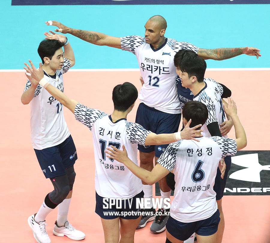 [스포티비뉴스=안산, 곽혜미 기자] 2018-2019 도드람 V리그 남자부 OK저축은행과 우리카드의 경기가 28일 오후 안산 상록수체육관에서 열렸다. 셧아웃으로 승리한 우리카드 선수들이 기뻐하고 있따
