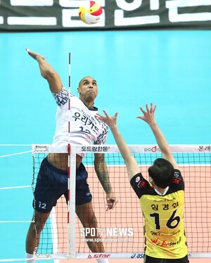 [스포티비뉴스=안산, 곽혜미 기자] 2018-2019 도드람 V리그 남자부 OK저축은행과 우리카드의 경기가 28일 오후 안산 상록수체육관에서 열렸다. 우리카드 아가메즈가 공격을 시도하고 있다.