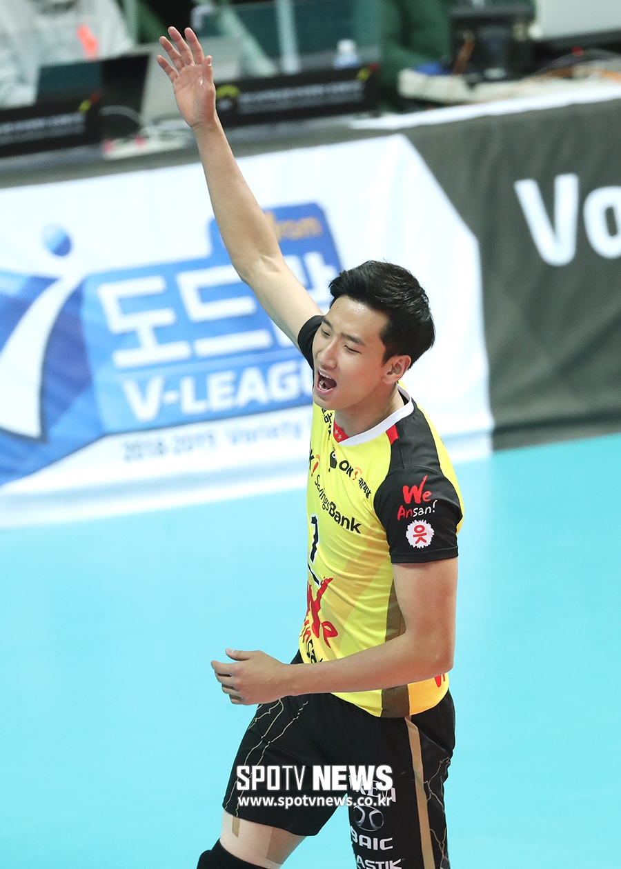 [스포티비뉴스=안산, 곽혜미 기자] 2018-2019 도드람 V리그 남자부 OK저축은행과 우리카드의 경기가 28일 오후 안산 상록수체육관에서 열렸다. OK저축은행 송명근이 득점에 기뻐하고 있다.