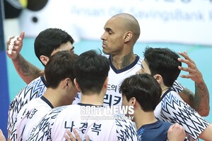 [스포티비뉴스=안산, 곽혜미 기자] 2018-2019 도드람 V리그 남자부 OK저축은행과 우리카드의 경기가 28일 오후 안산 상록수체육관에서 열렸다. 우리카드 아가메즈가 선수들과 포옹을 나누고 있다.