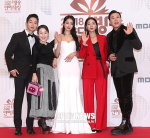 [스포티비뉴스=서울, 곽혜미 기자] 2018 MBC 방송연예대상 레드카펫 행사가 29일 오후 서울 마포구 상암동 MBC 미디어센터에서 열렸다. 김정현 아나운서, 박나래, 경리, 설인아, 이상민이 포즈를 취하고 있다.