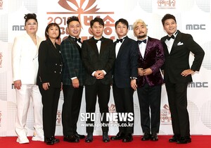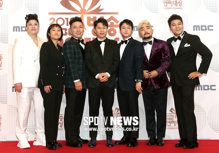 [스포티비뉴스=서울, 곽혜미 기자] 2018 MBC 방송연예대상 레드카펫 행사가 29일 오후 서울 마포구 상암동 MBC 미디어센터에서 열렸다. 이영자, 송은이, 이승윤, 양세형, 박성광, 유병재, 전현무(왼쪽부터)가 포즈를 취하고 있다.