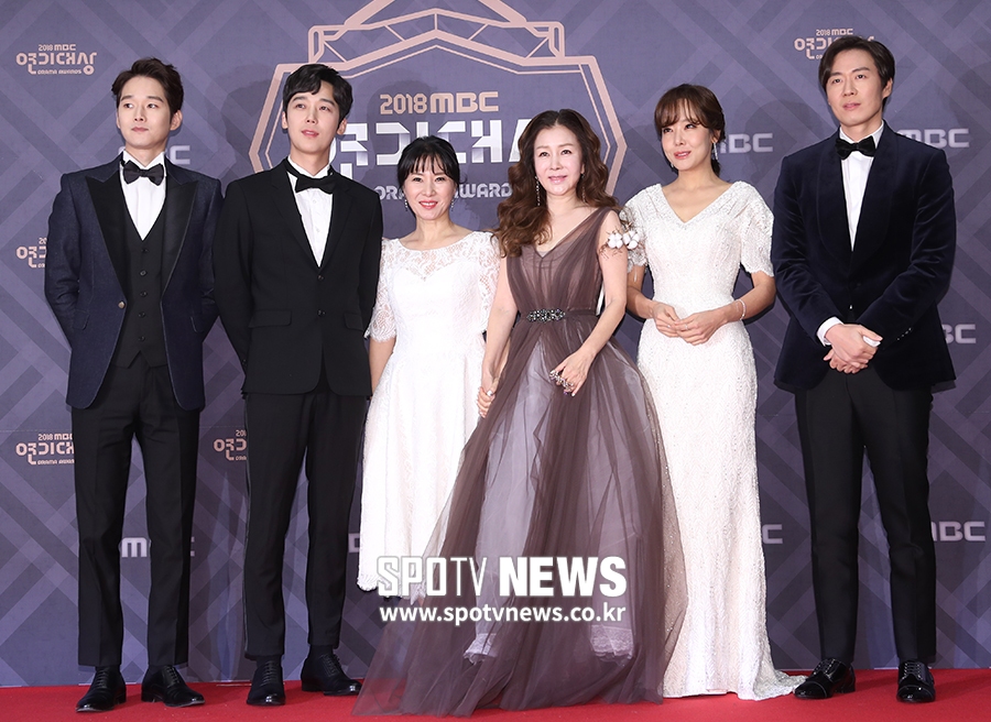 [스포티비뉴스=서울, 곽혜미 기자] 2018 MBC 연기대상 레드카펫 행사가 30일 오후 서울 마포구 상암동 MBC미디어센터에서 열렸다. 배우 임강성, 윤종훈, 황영희, 박준금, 소유진, 연정훈(왼쪽부터)이 포즈를 취하고 있다.