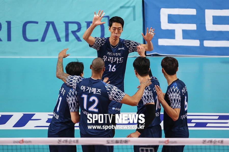 [스포티비뉴스] 우리카드와 삼성화재의 2018-2019 도드람 V리그 남자부 경기가 31일 오후 서울 장충체육관에서 열렸다. 득점에 성공한 우리카드 선수들이 기뻐하고 있다. (사진=우리카드 제공)