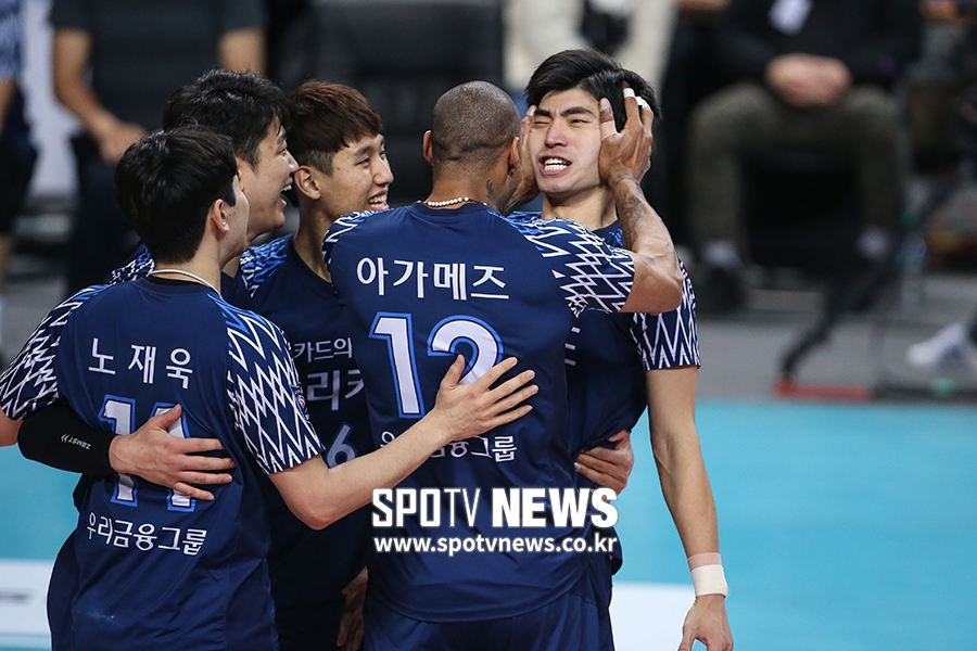 [스포티비뉴스] 우리카드와 삼성화재의 2018-2019 도드람 V리그 남자부 경기가 31일 오후 서울 장충체육관에서 열렸다. 득점에 성공한 우리카드 선수들이 기뻐하고 있다. (사진=우리카드 제공)