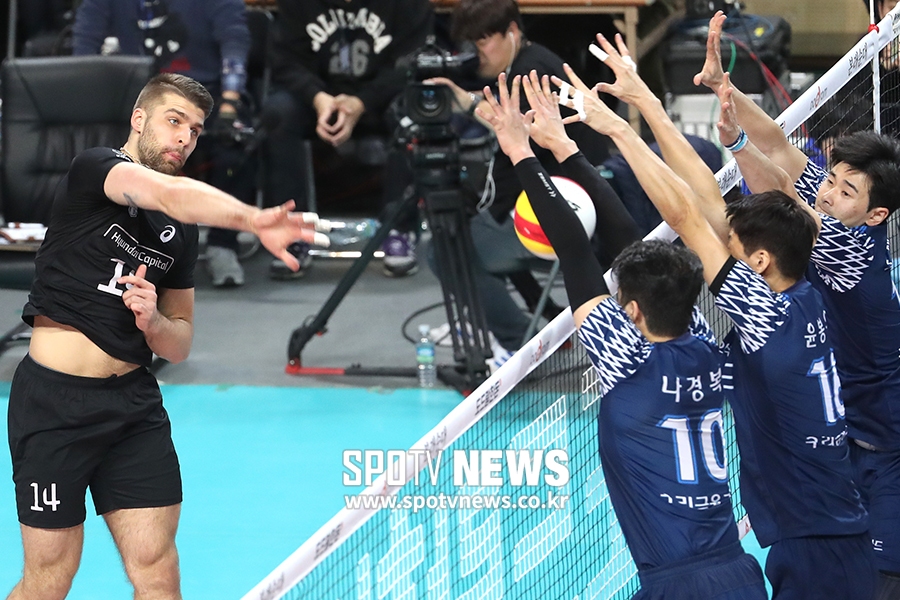 [스포티비뉴스=서울, 곽혜미 기자] 2018-2019 도드람 V리그 남자부 우리카드와 현대캐피탈의 경기가 3일 오후 서울 장충체육관에서 열렸다. 현대캐파탈 파다르가 블로킹에 걸리고 있다.
