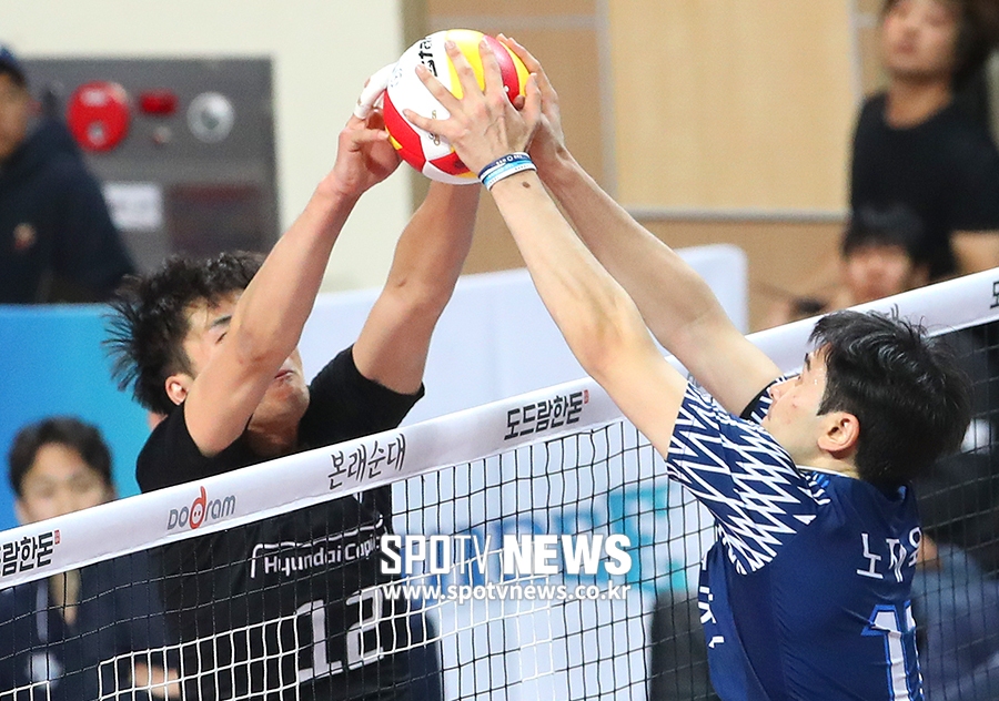 [스포티비뉴스=서울, 곽혜미 기자] 2018-2019 도드람 V리그 남자부 우리카드와 현대캐피탈의 경기가 3일 오후 서울 장충체육관에서 열렸다. 현대캐피탈 전광인과 우리카드 노재욱이 네트 위 볼 다툼을 벌이고 있다.