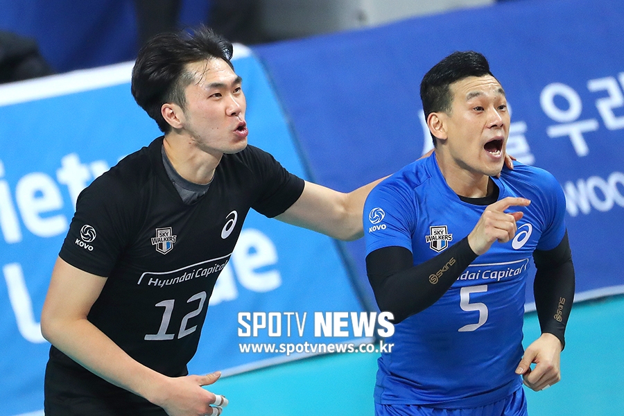 [스포티비뉴스=서울, 곽혜미 기자] 2018-2019 도드람 V리그 남자부 우리카드와 현대캐피탈의 경기가 3일 오후 서울 장충체육관에서 열렸다. 득점에 성공한 현대캐피탈 전광인과 여오현이 기뻐하고 있다.
