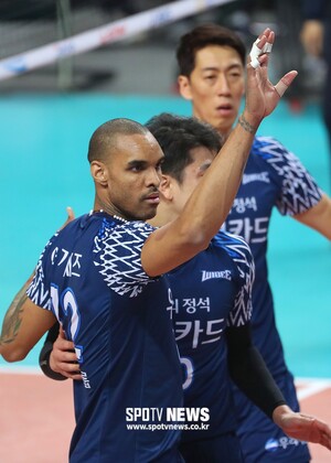[스포티비뉴스=서울, 곽혜미 기자] 2018-2019 도드람 V리그 남자부 우리카드와 현대캐피탈의 경기가 3일 오후 서울 장충체육관에서 열렸다. 득점에 성공한 아가메즈가 기뻐하고 있다.