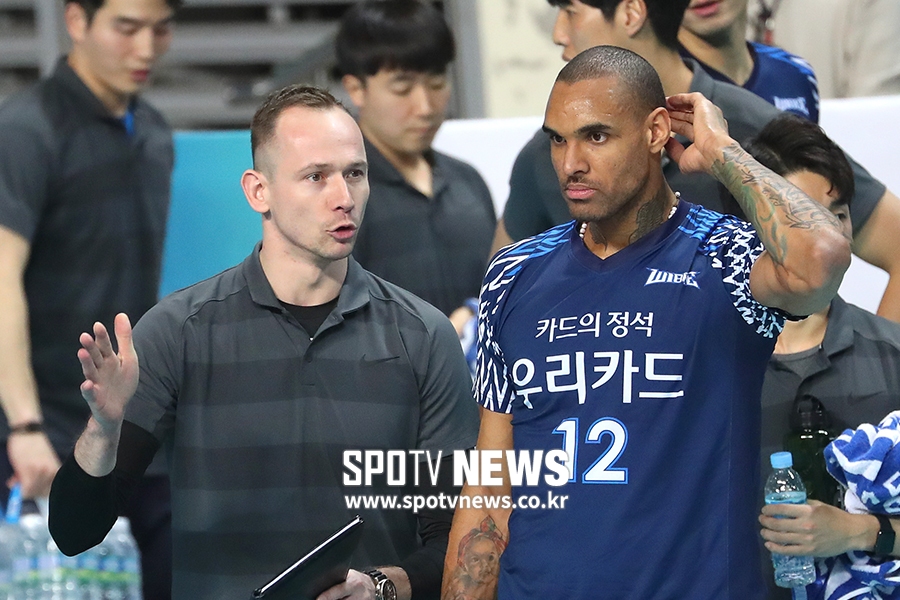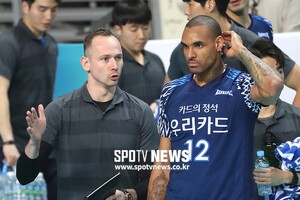 [스포티비뉴스=서울, 곽혜미 기자] 2018-2019 도드람 V리그 남자부 우리카드와 현대캐피탈의 경기가 3일 오후 서울 장충체육관에서 열렸다. 우리카드 마틴 코치와 아가메즈가 대화를 나누고 있다.