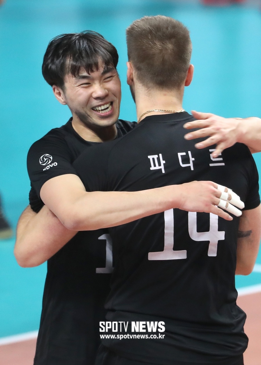 [스포티비뉴스=서울, 곽혜미 기자] 2018-2019 도드람 V리그 남자부 우리카드와 현대캐피탈의 경기가 3일 오후 서울 장충체육관에서 열렸다. 득점에 성공한 현대캐피탈 전광인과 파다르가 포옹을 하고 있다.