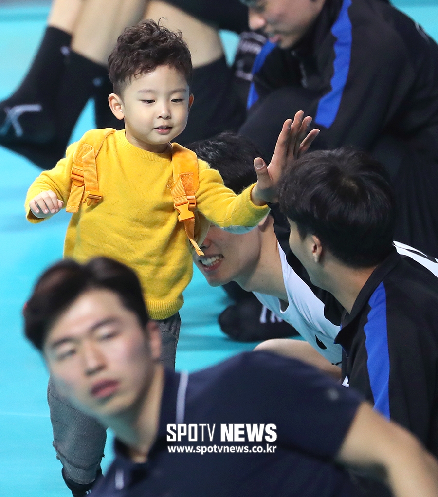 [스포티비뉴스=서울, 곽혜미 기자] 2018-2019 도드람 V리그 남자부 우리카드와 현대캐피탈의 경기가 3일 오후 서울 장충체육관에서 열렸다. 세트스코어 3-2로 승리한 현대캐피탈. 문성민 아들 문시호가 삼촌들과 하이파이브를 하고 있다.