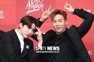 [스포티비뉴스=서울, 곽혜미 기자] 제 33회 골든디스크 어워즈 레드카펫 행사가 6일 오후 서울 구로구 고척스카이돔에서 열렸다. 몬스타엑스 기현(왼쪽), 셔누가 포즈를 취하고 있다.