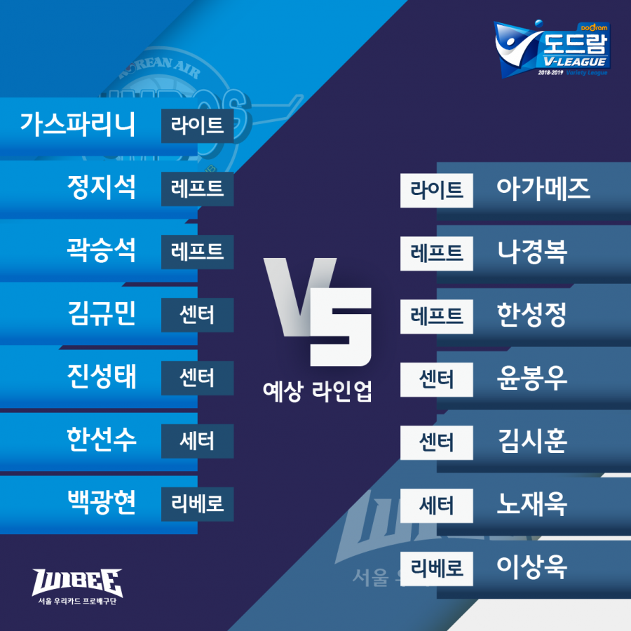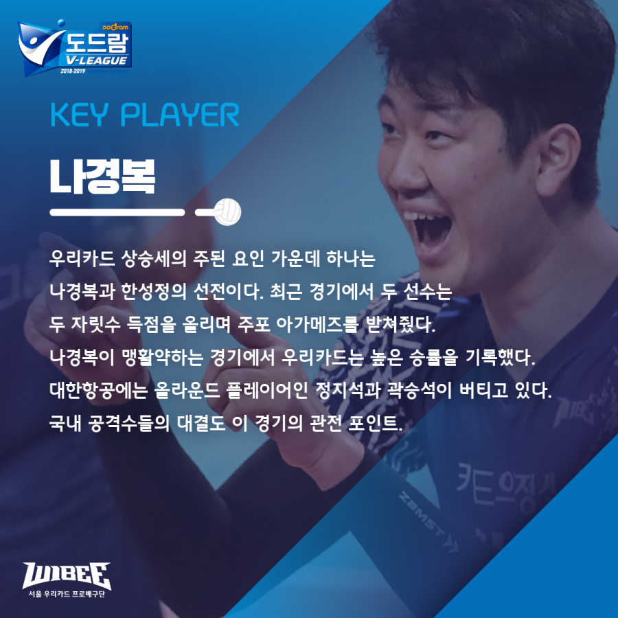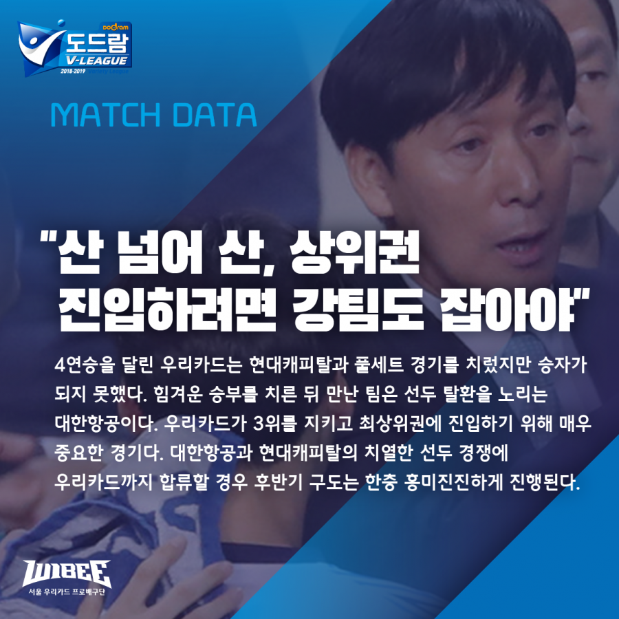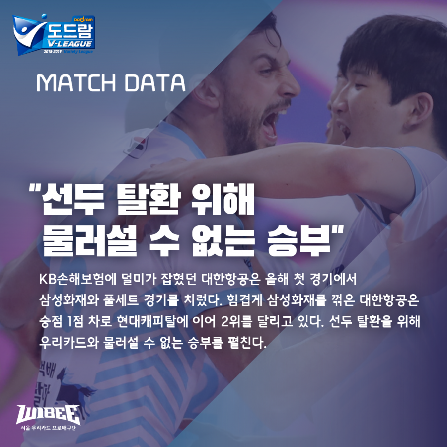 우리카드는 7일 인천 계양체육관에서 열리는 도드람 2018~2019 시즌 프로배구 V리그 남자부 4라운드 경기에서 대한항공을 만난다. '디펜딩 챔피언'인 대한항공은 승점 1점 차로 현대캐피탈에 이어 2위를 달리고 있다.