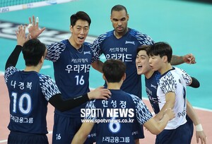 [스포티비뉴스=인천, 한희재 기자] 대한항공과 우리카드의 2018-2019 도드람 V리그 남자부 경기가 7일 오후 인천 계양체육관에서 열렸다. 득점을 올린 우리카드 선수들이 기뻐하고 있다.
