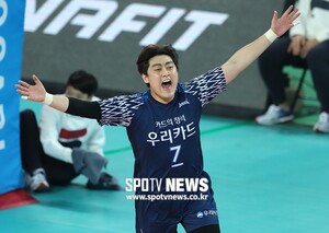 [스포티비뉴스=인천, 한희재 기자] 대한항공과 우리카드의 2018-2019 도드람 V리그 남자부 경기가 7일 오후 인천 계양체육관에서 열렸다. 우리카드 유광우가 팀 득점에 기뻐하고 있다.